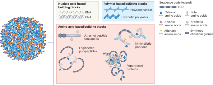 Tässä katsauksessa esitellään nanoteknologiaan perustuva lähestymistapa biomolekyylikondensaattoreiden molekyylisuunnitteluun synteettisistä vaihe-erotusyksiköistä, joilla on sovelluksia lääkkeiden toimituksessa, katalyysissä, soluvapaissa proteiinitehtaissa, antureissa ja 3D-bioprinttauksessa.